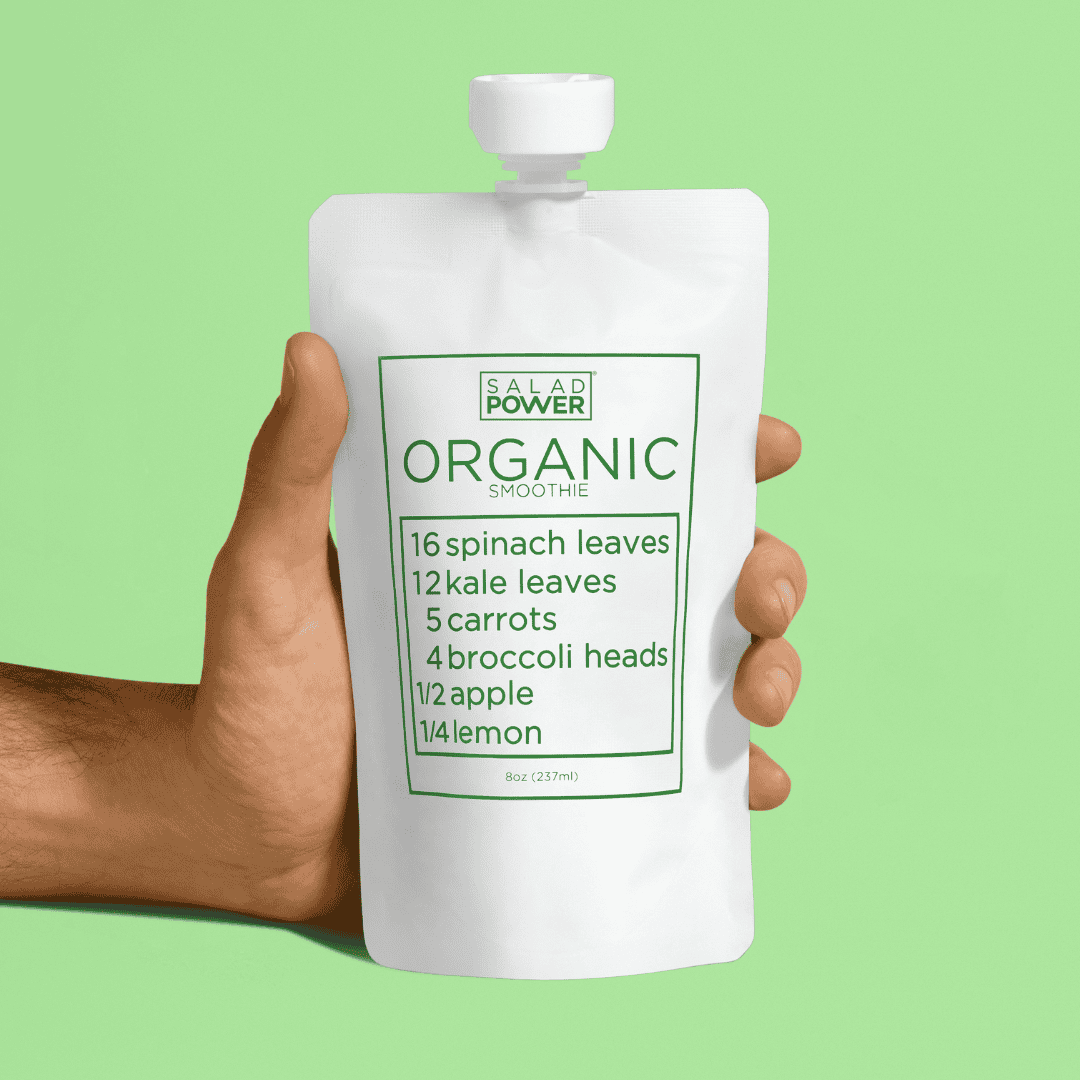 A: SaladPower is a USDA Certified Organic smoothie that delivers 2x your daily vegetable requirement in every pouch. It's amazing!