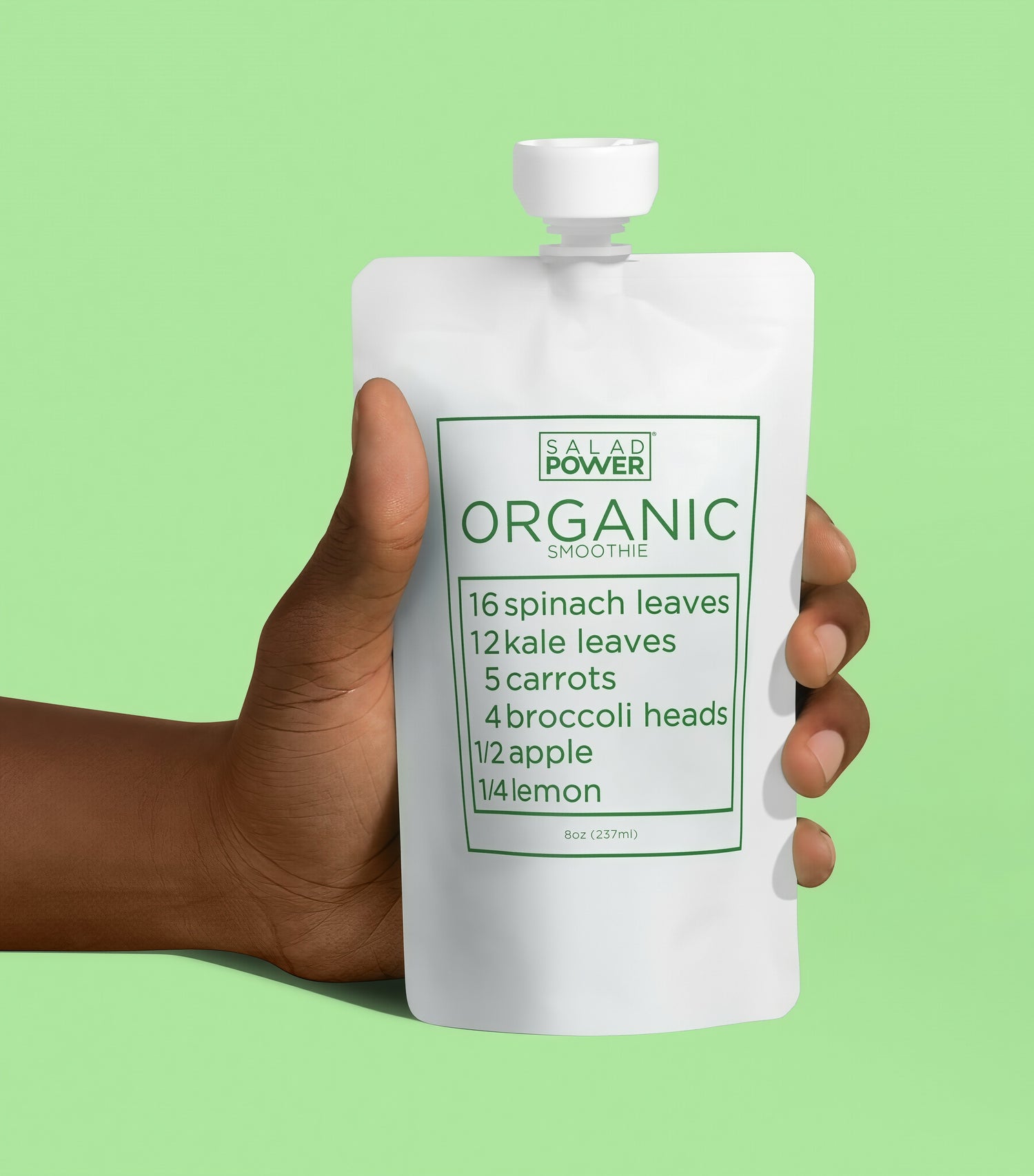 SaladPower pouches have some amazing technology behind them. They allow SP to be completely shelf-stable without the need for preservatives or other funny business. How? Our pouches block 100% of the oxygen and 100% of the light from getting inside. That means no refrigeration is necessary and nutrients get locked in. Once you twist the cap and break the seal, the perishability clock starts! We recommend drinking every pouch (chilled for best taste!) within four hours of uncapping for maximum nutritional benefit. Plus, they're super fun to sip from.